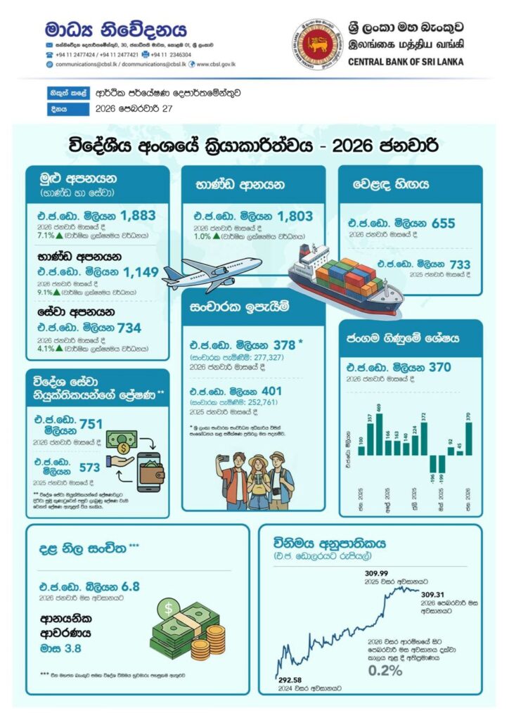 ආනයනවල වර්ධනයට වඩා අපනයනවල වර්ධනය ඉහළ යෑම නිසා වාර්ෂික ලක්ෂ්යමය පදනම මත 2026 වසරේ ජනවාරි මාසයේ දී වෙළඳ භාණ්ඩ ගිණුමේ හිඟය අඩුවිය.