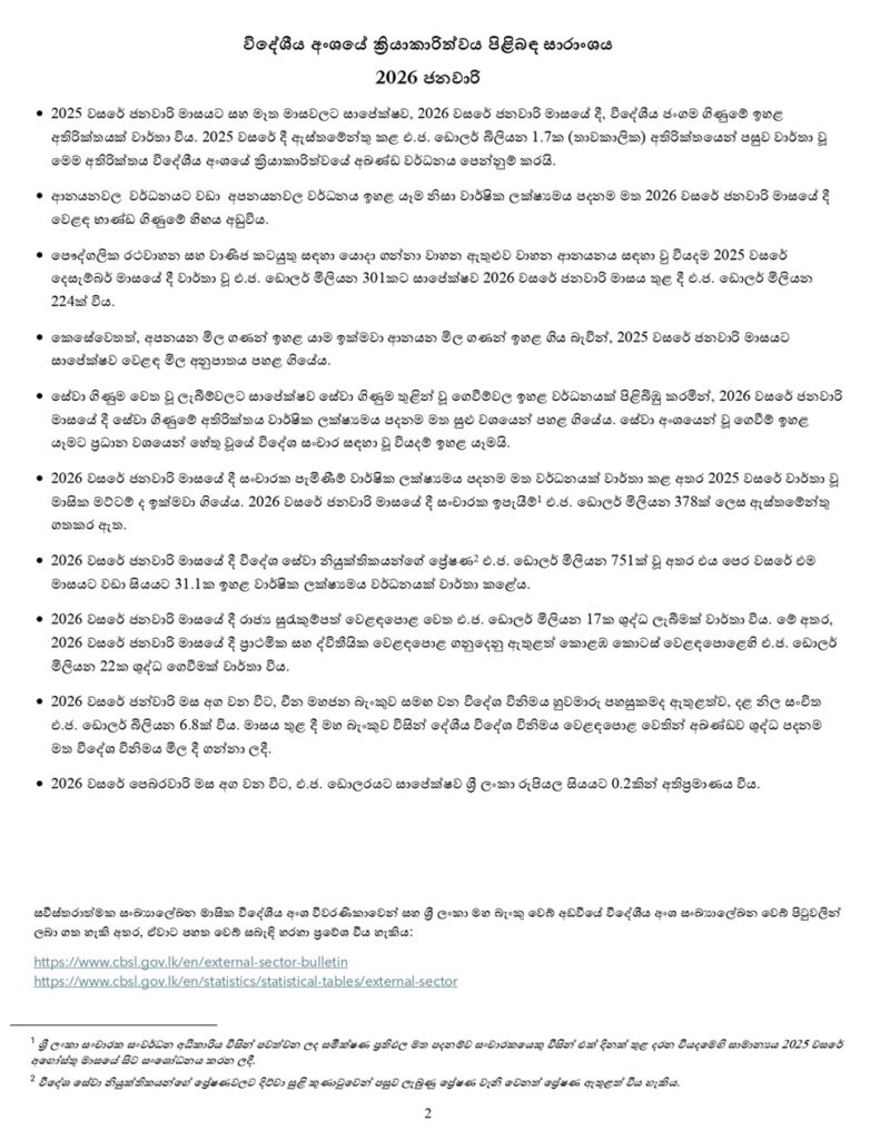 2025 වසරේ දී ඇස්තමේන්තු කළ එ.ජ. ඩොලර් බිලියන 1.7ක (තාවකාලික) අතිරික්තයෙන් පසුව වාර්තා වූ මෙම අතිරික්තය විදේශීය අංශයේ ක්රියාකාරිත්වයේ අඛණ්ඩ වර්ධනය පෙන්නුම් කරයි.