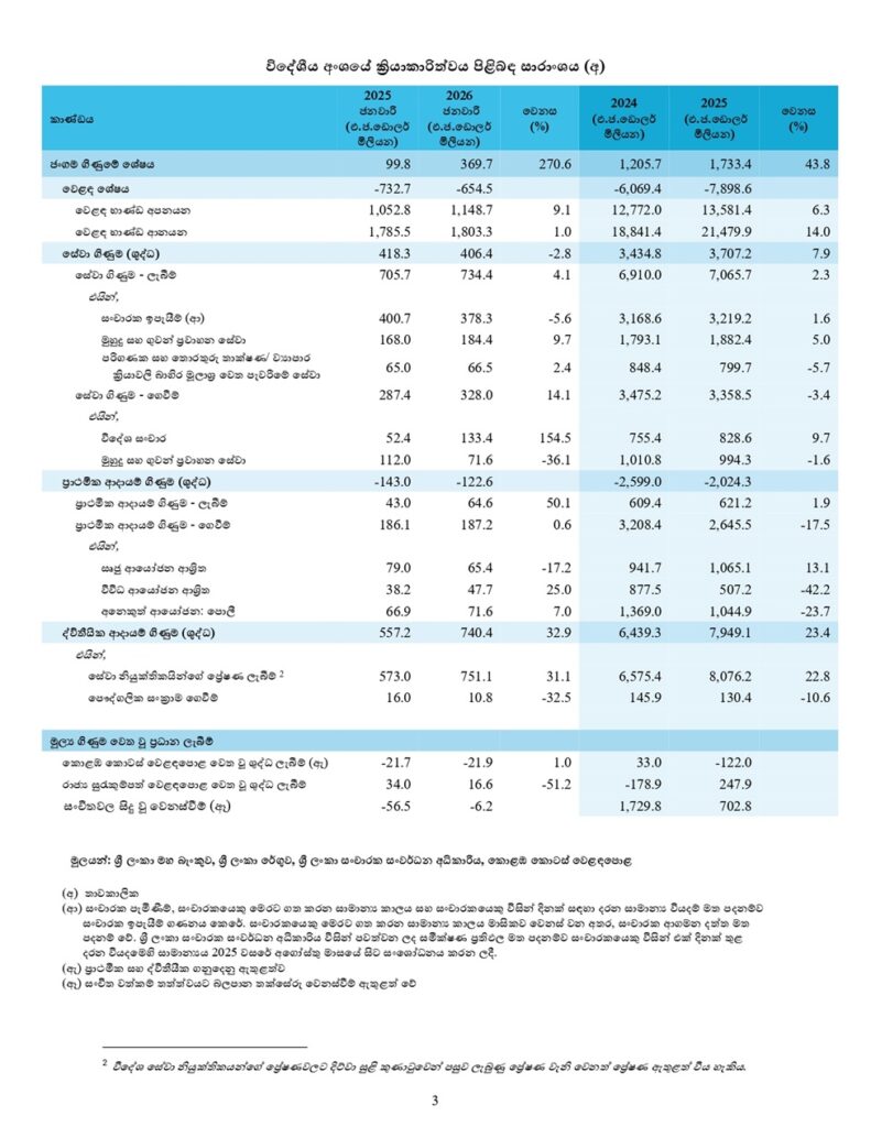 2025 වසරේ ජනවාරි මාසයට සහ මෑත මාසවලට සාපේක්ෂව, 2026 වසරේ ජනවාරි මාසයේ දී, විදේශීය ජංගම ගිණුමේ ඉහළ අතිරික්තයක් වාර්තා වූ බව ශ්රී ලංකා මහ බැංකුව පවසයි.