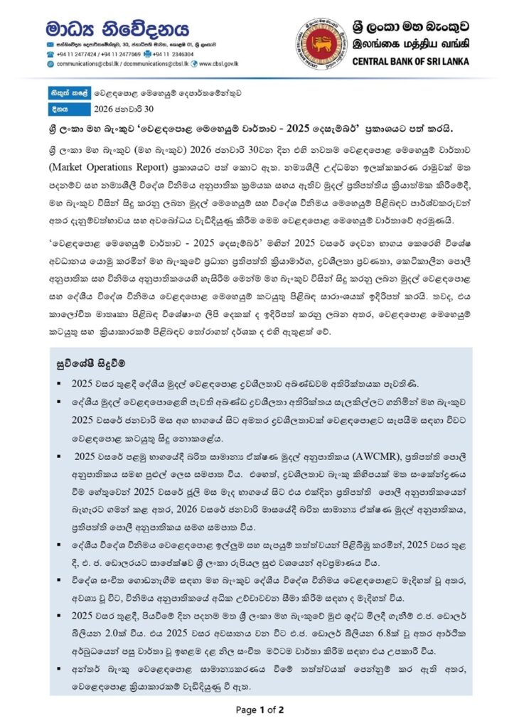 ශ්රී ලංකා මහ බැංකුව (මහ බැංකුව) 2026 ජනවාරි 30වන දින එහි නවතම වෙළඳපොළ මෙහෙයුම් වාර්තාව (Market Operations Report) ප්රකාශයට පත් කොට ඇත. නම්යශීලී උද්ධමන ඉලක්කකරණ රාමුවක් මත පදනම්ව සහ නම්යශීලී විදේශ විනිමය අනුපාතික ක්රමයක සහය ඇතිව මුදල් ප්රතිපත්තිය ක්රියාත්මක කිරීමේදී, මහ බැංකුව විසින් සිදු කරනු ලබන මුදල් මෙහෙයුම් සහ විදේශ විනිමය මෙහෙයුම් පිළිබඳව පාර්ශ්වකරුවන් අතර දැනුම්වත්භාවය සහ අවබෝධය වැඩිදියුණු කිරීම මෙම වෙළඳපොළ මෙහෙයුම් වාර්තාවේ අරමුණයි.