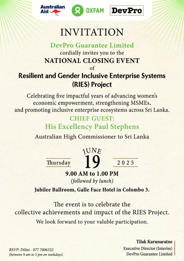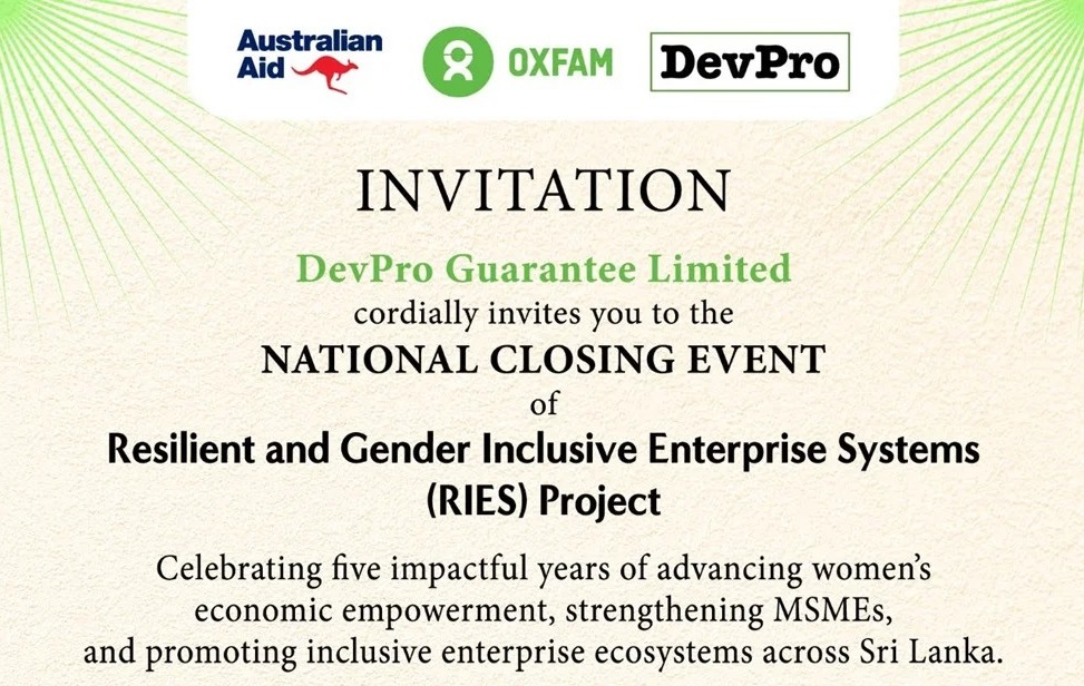 ඕස්ට්රේලියානු රජයේ අරමුදල් යටතේ ක්රියාත්මක වන ‘ප්රතිරෝධී සහ ස්ත්රී පුරුෂ භාවය ඇතුළත් ආර්ථික පද්ධති (Resilient and Gender Inclusive Economic Systems – RIES)’ ව්යාපෘතියේ ජාතික සමාප්ති උත්සවය 2025 ජුනි 19 වන බ්රහස්පතින්දා පෙ.ව. 9 ට කොළඹ ගෝල් ෆේස් හෝටලයේදී පැවැත්වීමට නියමිතය.