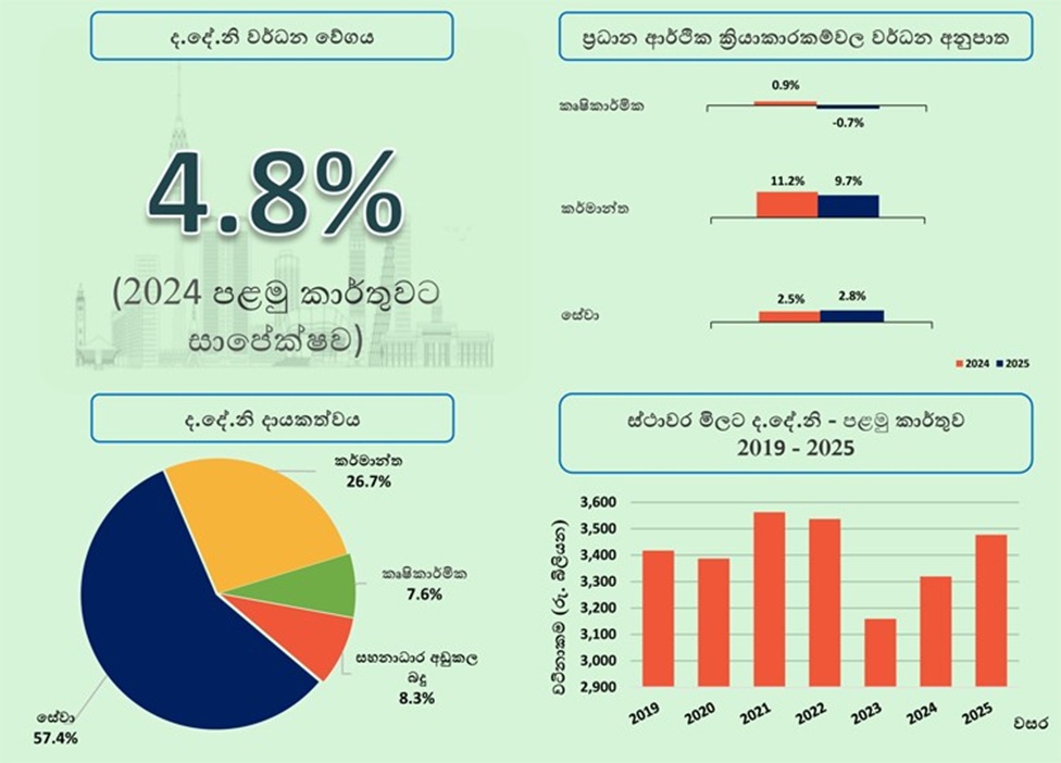 ඒ අනුව 2025 වර්ෂයේ පළමුවන කාර්තුවේ දළ දේශීය නිෂ්පාදිතයේ වර්ධනය 4.8% ක ධනාත්මක වර්ධනයක් ලෙස වාර්තාවී ඇත.